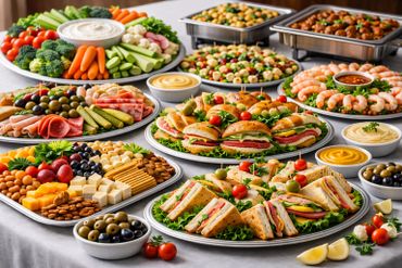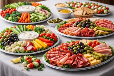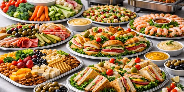 Options include sandwich platters and wraps, filled rolls and pastries, fresh salads, crudités with dips, and meat & cheese platters.